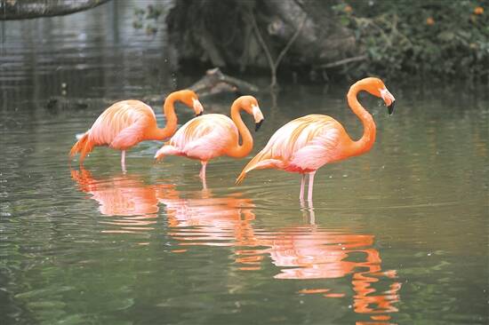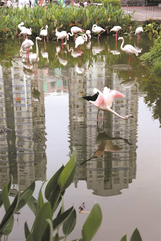 火烈鸟展翅,城市建筑倒映在水中,广州动物园入口的这一景象,引人入胜