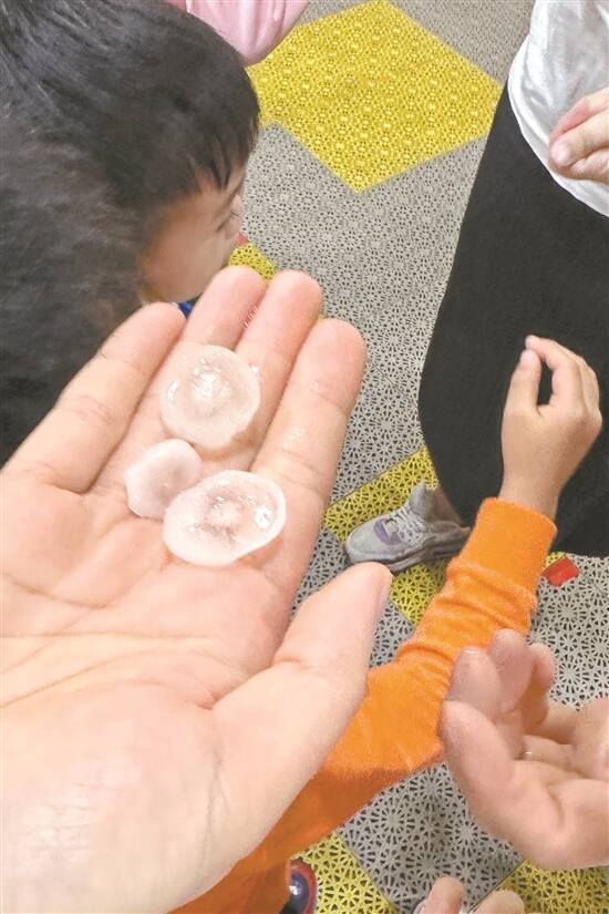 “这是一种少见的天气现象,大家不要惊慌。”位于白云区机场路附近的民航广州幼儿园,不少孩子目睹冰雹跌落地面。在给孩子们上课的老师们,看到孩子们个个好奇地望向窗外后,在确保孩子们安全的前提下带大家到屋檐下观看操场的冰雹,并向孩子们科普天气常识。