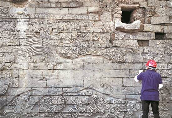 工作人员在清理河南开封州桥遗址出土的巨幅石雕祥瑞壁画 新华社发