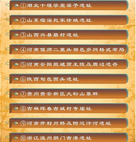 湖北十堰学堂梁子遗址、山东临淄赵家徐姚遗址、山西兴县碧村遗址、河南偃师二里头都邑多网格式布局、河南安阳殷墟商王陵及周边遗存、陕西旬邑西头遗址、贵州贵安新区大松山墓群、吉林珲春古城村寺庙址、河南开封州桥及附近汴河遗址、浙江温州朔门古港遗址等十个项目入选2022年度十大考古新发现。