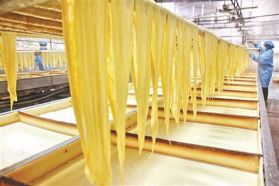 一张张腐竹在生产线上成型