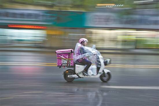 员村二横路,一位外卖小哥骑着电瓶车在雨中飞驰而过