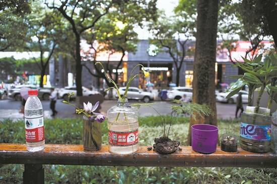 广州人善于利用“现成品”。这是建设六马路一家士多店的盆栽
