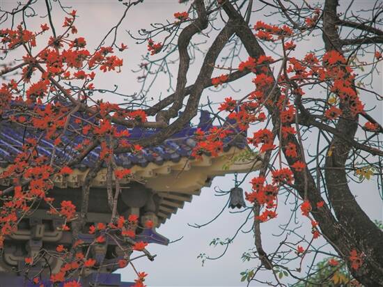 中山纪念堂主建筑外的木棉花。盛开之后,在春雨中进入落花时节
