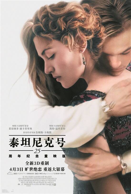 “我甚至连一张他的画像都没有,但他永远活在我心中。”《泰坦尼克号》的浪漫爱情曾打动全世界观众的心。影片在1997年首映,1998年引进中国,2012年以3D重制版再次引进。前两次来中国,《泰坦尼克号》分别取得3.59亿元和9.47亿元的票房。如今,《泰坦尼克号》迎来25周岁生日,影片也将第三次登上中国大银幕。影片制式再次升级,导演詹姆斯·卡梅隆亲自参与了3D、4K、HDR、高帧率的重制。