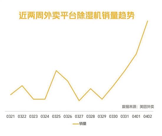 “近一周,除湿机销量周环比暴涨200%。” 美团外卖数码家电相关负责人表示,自3月21日以来,除湿机销量迅速攀升。从全国来看,除湿机销量主要集中在广东、上海等南方省份,其中90%订单来自广东。“除湿机销量TOP5城市,分别是广州、佛山、东莞、上海、深圳,广东城市占四个”。