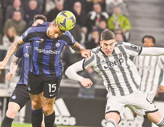 尤文图斯球员弗拉霍维奇(右)与国际米兰球员阿切尔比在比赛中争顶 新华社发