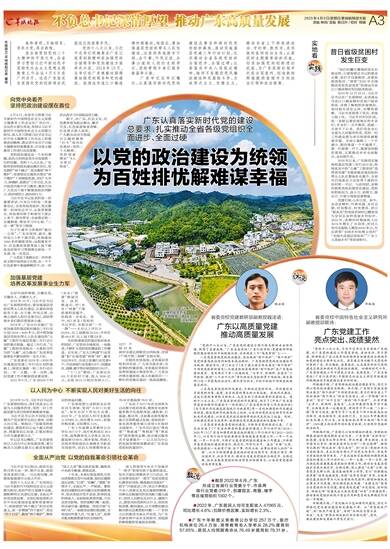 三是高度重视基层党组织建设,不断夯实党的执政之基。广东先后实施了《广东省加强党的基层组织建设三年行动计划(2018—2020年)》《广东省加强党的基层组织建设三年行动计划(2021—2023年)》,以专项行动计划统筹推进各领域基层党建工作,一年一个主题、一步一个台阶,不断扩大基层党的组织覆盖和工作覆盖,不断提升基层党组织建设制度化、规范化、科学化水平。通过“头雁”工程,培养选拔出一大批有干劲、会干事、作风正派、办事公道的人担任“头雁”,从而不断增强基层党组织的政治领导力、思想引领力、群众组织力、社会号召力,推动全省基层党组织全面进步、全面过硬,把全省基层党组织锻造得更加坚强有力,以高质量党建推动高质量发展。