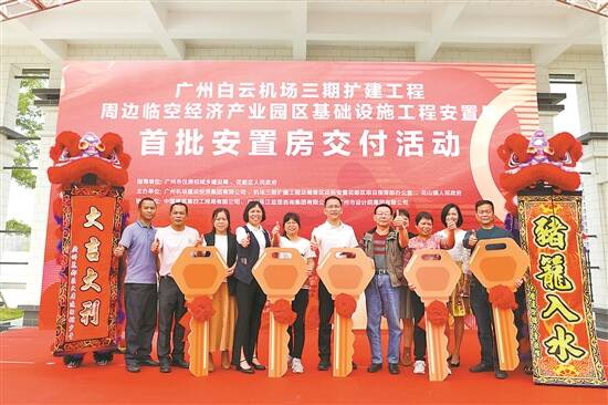 12日,广州白云国际机场三期扩建工程周边临空经济产业园区基础设施项目首批安置房正式交付,广州机场建设投资集团有限公司联合机场三期扩建工程及噪音区征拆安置花都区项目指挥部办公室和花山镇人民政府,将首批17栋共1063套安置房正式交付至回迁村民。