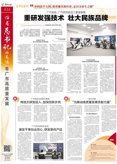 参观实验室后,习近平总书记同科技人员、企业家、职工、外资企业代表等交流并发表讲话。总书记强调,中国是个大国,要重视实体经济,走自力更生之路。关键核心技术要立足自主研发,也欢迎国际合作。“我感觉自己身上的担子更重了。”吴坚表示,今后他将立足汽车制造产业领域,更好发挥科技工作者的作用,为广东高质量发展贡献一份力量。据他介绍,广汽研究院已初步建立了“三国五地”(广州、上海、厦门、洛杉矶、米兰)全球研发网,汇聚11个国家和地区的科技人才。