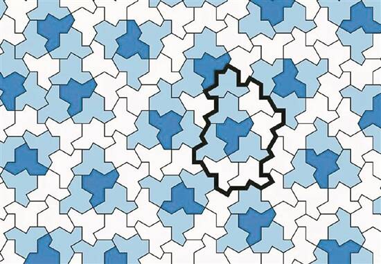 这种单铺砌块的“非周期性”,其实是指由这种形状构成的整体图案,“不能通过平移或旋转来恢复相同的图案”。它不同于像国际象棋棋盘那样的图案,那种棋盘图案如果平移两格,看上去也毫无区别。