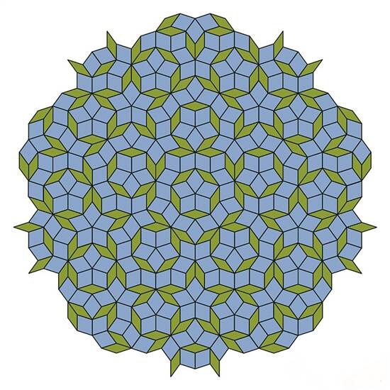 人们发现,要寻找这种非周期性、非重复性铺砌的图案竟相当不容易。数学家们最初发现的非周期铺砌块是由超过两万种形状组成的,但后来才慢慢减少到仅由两种形状组成的非周期铺砌块,也就是著名的彭罗斯铺砌。它是在20世纪70年代,由数学家罗杰·彭罗斯发现的,使用了两种不同的菱形完成了非周期性铺砌。这两个形状组成的图案在现代的很多家居装饰中经常出现。彭罗斯平铺包含多种对称性,但它永远无法周期性重复。