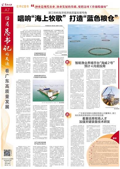 2023年广东省政府工作报告明确提出,“做大做强海洋经济,加快建设海洋强省”“大力发展海洋牧场和深远海养殖”。近年来,湛江在海洋牧场装备领域异军突起,吹响海洋经济高质量发展号角,大力推动智慧渔业发展,建设完善深远海养殖技术和装备产业全产业链,推动形成千亿级产业集群,奋力打造海洋牧场先行示范市。