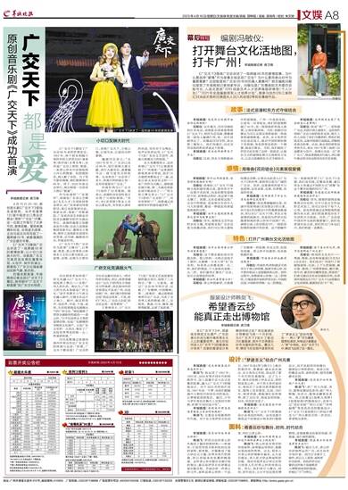 冯敏仪:岭南的文化名片——粤剧、粤曲,还有岭南童谣《月光光》《点虫虫》。我们还对广州进行了浓缩版展现,比如,上下九的骑楼、麻石街、琶洲、广州塔等地标,艇仔粥、炒牛河、紫苏炒田螺等美食,希望老广们看完剧后会有亲切感和共鸣,也希望外地朋友打开《广交天下》这张舞台文化活地图,跟着我们打卡广州。