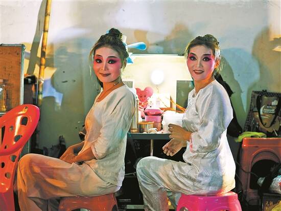 凤霞凤霜这对双胞胎,发型都一样,深绿加点黄,不化妆像一个人,化了妆像另一个人。她们2022年从湛江艺术学校毕业后进入了剧团。