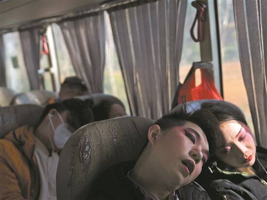 夜色已深,演了一天一夜的他们酣睡了,大巴在乡下的小道上行驶。偶尔一辆对面驶来的车,照亮了睡眠中的他们。