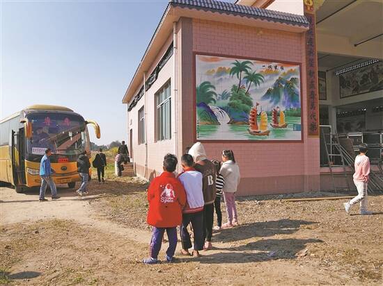 村里孩子们在遂溪县山后仔村文化楼戏台前看演员们到来
