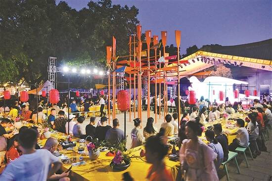 晚上,泮塘五约长老、面点师傅等人共同揭开蒸笼,为“长桌宴”举行开宴仪式。“三月三·长桌宴”以“回”字型的搭建,“回”字连接着燕子飞翔的舞台,构成春回大地、一切得以顺利回归的美妙寓意。宴会上,泮塘五秀、岭南佳果、荠菜煮鸡蛋、盆菜等美食悉数登场。