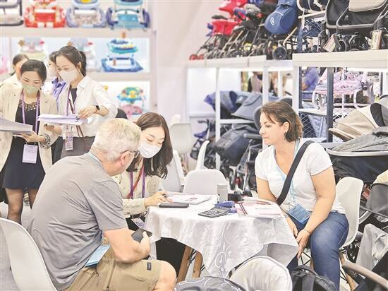 深圳市广瑞贸易发展有限公司总经理也半开玩笑地说道:“新增孕婴童展区,让我们更忙啦!”记者留意到,尽管才是开张第一天,展位现场的会议桌已“座无虚席”。多位国外采购商带着平板电脑和手册,或是对接价格、货量和改装要求,或是让业务员展示手推车、学步车、童床等产品。