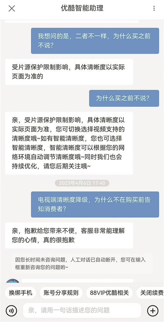截屏为记者以用户身份追问优酷客服,电视端视频画质降级,为何没有提前说明