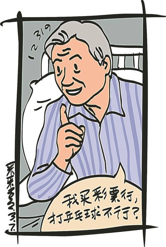 老牛见老熊神志清醒,已脱离危险,挺了挺自己笔直的腰杆,说:“你出院后,常到我家走动,适当运动,有利于健康。”老熊探起身:“我买彩票行,打乒乓球不行?球场见。”