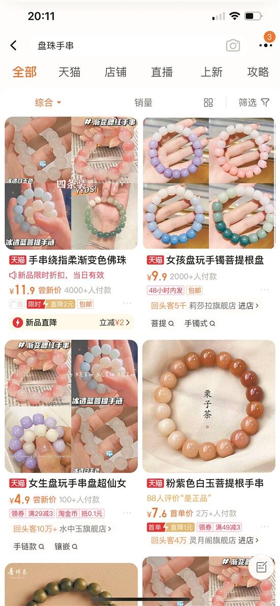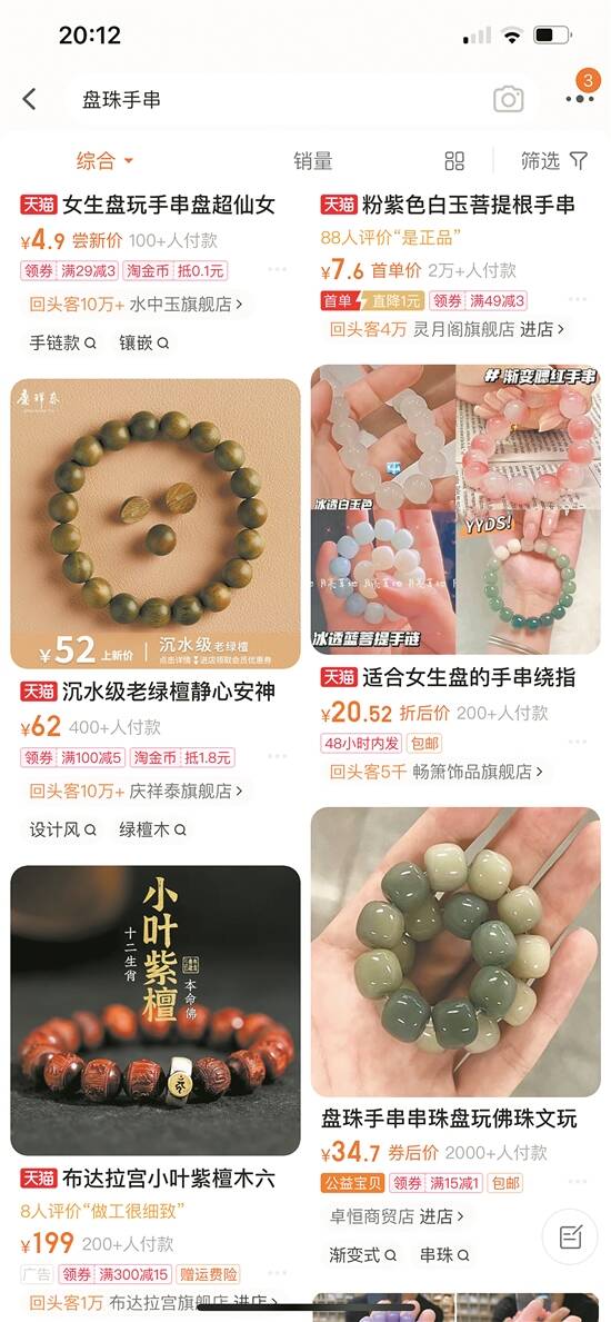 记者登录电商平台,输入“盘串”“手串”“学生盘串”等关键词,日销万件的商家比比皆是。不过,孩子们对手串的取舍与成年人的取向不同,销路最好的是五颜六色仿菩提、仿玉质手串,价格以几元、十几元居多。
