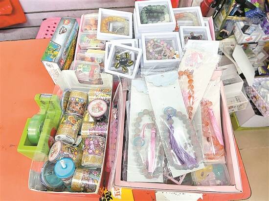 记者在广州海珠区南武文润学校附近的文具店看到,手串摆在收银台很显眼的位置,文具店老板也推荐说,这是目前最火爆的玩具,很多学生放学后都会来买。记者看到,收银台旁摆着各种各样的串珠,有塑料材质的、有玻璃材质的,也有号称菩提根材质的。价格在8—12元不等。