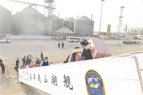 当地时间4月26日,撤离苏丹人员登上中国海军军舰 新华社发