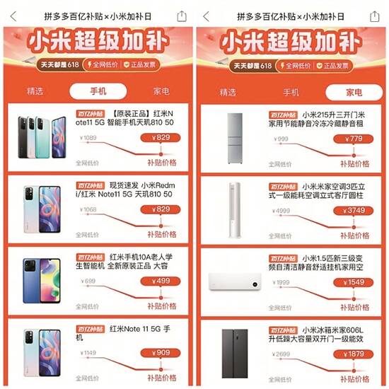 近日,拼多多百亿补贴“数码家电消费季”再次对手机、电视、空调、冰箱等数码家电产品发放超额补贴,小米等品牌产品的补贴力度均超过20%,继续击穿全网低价,为消费者提供“天天都是618”的购物体验。
