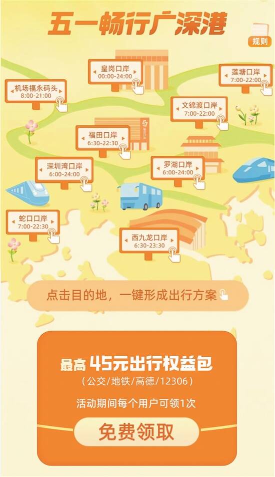 号称五年来最火的“五一”小长假即将到来,国内多个热门旅游城市如大理、青岛等已经一“房”难求。而在境外游方面,具备地利条件的广东人赴港澳旅行人数激增。记者近日在支付宝上发现,支付宝专门推出了“畅游广深港”专题页面,该页面集成了高铁在线订票、口岸通关路线、通关政务服务等信息,并提供最高45元出行红包。值得一提的是,该页面还支持用户点击如“深圳湾口岸”“西九龙口岸”等目的地,一键形成出行方案,方便用户出行。