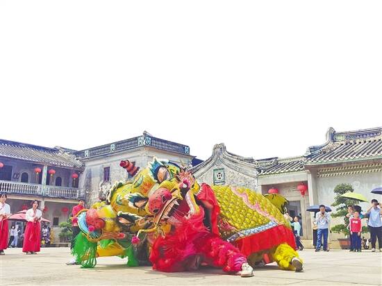 4月29日,汕头市“五一”民艺展演活动在澄海区陈慈黉故居举办。本次民艺展演活动以“文化引侨 推进高质量发展 相约侨乡”为主题,集中展示汕头非物质文化遗产、民间艺术作品,让市民游客近距离接触、亲身体验潮汕传统文化的魅力。据介绍,本次活动从4月29日持续至5月1日,200多名民间艺人参加展演。图为麒麟舞表演 曾柯权 摄影报道
