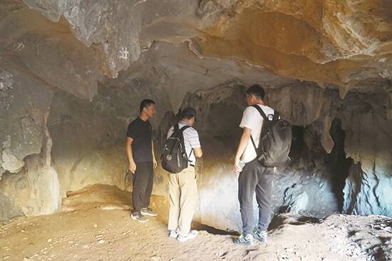 考古工作者在狮象遗址的石灰岩洞穴内勘探
