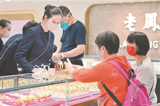 “客人好多,我忙到下午2点才吃饭!”4月30日,在广州东山百货大楼,东百黄金专柜值班经理黄先生在接待一波又一波顾客的间隙告诉羊城晚报记者,“五一”假期东百黄金专柜的折扣力度大、买金顾客多(见图,羊城晚报记者 曾育文 摄)。人来客往的热闹场景,同样出现在天河城百货的中国黄金、周大福等广州各大黄金专柜。专家表示,“五一”假期,黄金消费也迎来了“黄金周”。近日,记者走访天河城百货、广百百货,现场看到中国黄金、周大福、英皇珠宝、谢瑞麟、老凤祥、广百黄金等黄金专柜客流不断,大多是夫妻、好友共同前来买金。