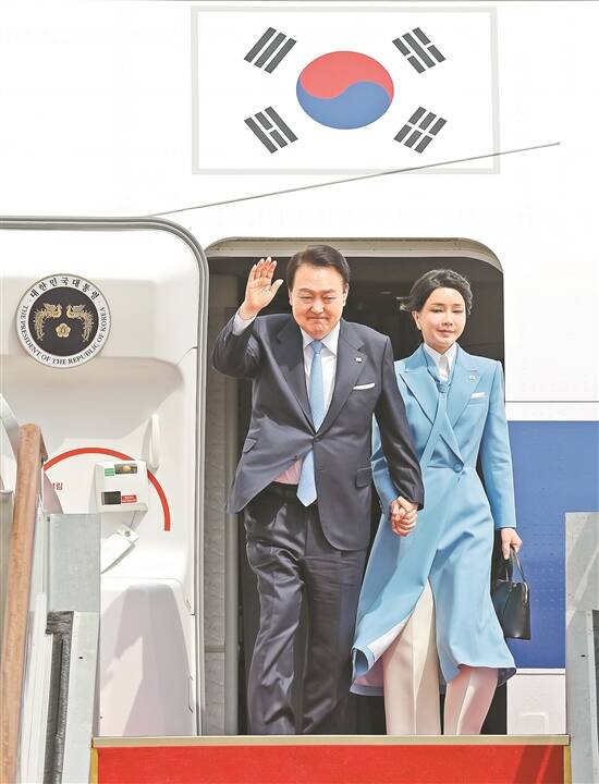 4月30日,尹锡悦结束对美国的国事访问回国,与妻子金建希从飞机上下来时挥手 图/视觉中国