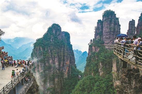 北帝山栈道是必走之路,远远望去,像山的腰带——不过,北帝山主山性别当属男性,它虎背熊腰,并非楚王喜欢的细腰。在玻璃栈道那一段,隔着玻璃向下看,下面的树木岩石在雾中便如水中的珊瑚,此时尽管雾气令视野受限,往下看,仍有种恐高的酥麻感,像蚂蚁一样沿着脚尖往上爬。但在玻璃栈道的一头,却有人无惧高空的惊险,在钢索上表演“孙悟空翻筋斗云”。当地旅游局的朋友告诉我们,这一钢索长300米,从此山横空“系”到彼山,表演者要在高空钢索上翻跟头,从一头翻到另一头,大约两三分钟能翻上100个跟头。那些表演者像电动玩具一样转动的情景,经常引来游客的尖叫。可惜我们遇上大雾,没能亲眼目睹此景。