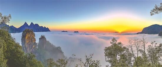 最后我站在海拔1100多米的北帝山高处环顾四周,桂东南第一高峰1581米的亚婆揽孙峰以及牛鼻山、大瑶山尽收眼底。峰顶还可见北帝山石林。这石林如同大自然经过千百年运动后隆起的肌肉,如今勾肩搭背地围拢在一起,又像是几兄弟凑在一块耳语……导游说,北帝山周边冬季水蒸气凝结的位置较低,云层也矮,山峰经常在云层之上探头,白云经常在山的腰间缭绕,偶尔还会出现冰冻雾凇,但春夏之际也常常云雾弥漫,山明山暗如何变幻,北帝如何“扮老装嫩”,全听天气“导演”。