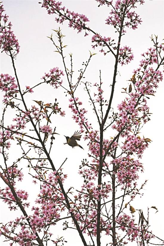 一树树的雪白、粉红、绛红,蒸腾在枝头,如云似锦,如凝住的雾;千万只、亿万只蜜蜂,花瓣一样飞着、嗡嗡地唱着……每年都有一个这样的春天,风托举着樱花如月光做的花瓣,飘飘摇摇地在空中打着旋,每一条街都是这样,每一条巷子都是这样,每一个院门外都是这样。