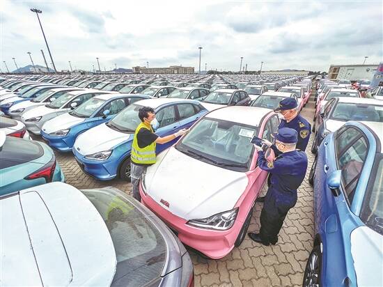 广州海关所属南沙海关关员对出口新能源汽车实施查验