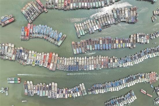 我国南海自5月1日起进入伏季休渔。5日,记者在广东阳江闸坡渔港见到,600多艘渔船全部回港,停泊在划定区域内,阵列齐整,桅杆林立,俯瞰之下蔚为壮观。 图/视觉中国