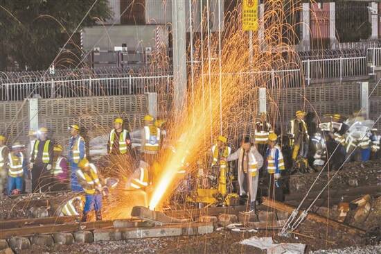 羊城晚报讯 记者李志文,通讯员吕翀、吴天龙、刘文思摄影报道:6日4时05分,经过现场2000余名建设者近300分钟的持续鏖战,广汕高铁新塘站广深线下元至仙村间Ⅲ、Ⅳ线线路拨连、接触网驳接、信号设备开通施工圆满完成,标志着新塘站普速站场顺利开通,下一步即将进入广汕高铁接入全面施工阶段,为广汕高铁如期开通运营打下坚实基础。