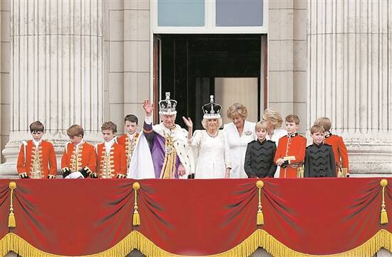 5月6日,在英国伦敦,英国国王查尔斯三世和王后卡米拉加冕后在白金汉宫阳台向民众挥手致意。