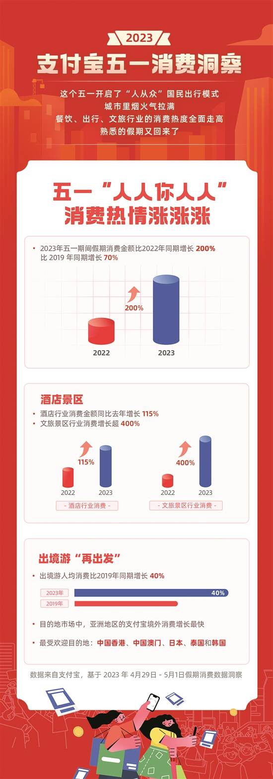 受益于旺盛的旅游需求,海外商家也被游客的消费热情惊到了。“五一”假期出境游人均消费比2019年同期增长达40%。在各大主要目的地市场中,亚洲地区的支付宝境外消费增长最快。中国香港依然是最受欢迎的旅游目的地,其次是中国澳门、日本、泰国和韩国。