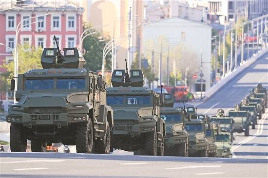 这是5月7日在俄罗斯首都莫斯科拍摄的即将参与彩排的装甲车。当日,莫斯科举行卫国战争胜利日阅兵式彩排 新华社发