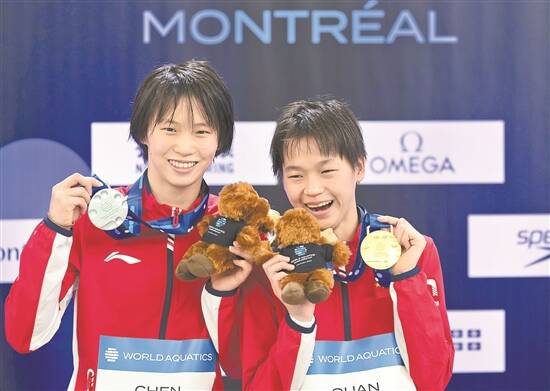 冠军全红婵(右)与亚军陈芋汐在颁奖仪式上合影 新华社发