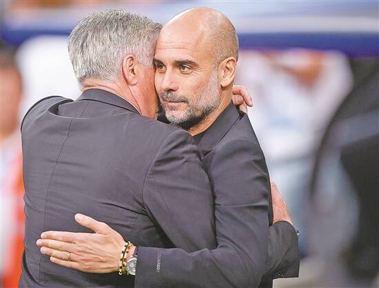 皇家马德里队主教练安切洛蒂(左)与曼城队主教练瓜迪奥拉在比赛前拥抱致意 新华社发