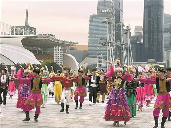 羊城晚报讯 记者黄宙辉、李焕坤报道:广东艺术精品进景区活动吹来“新”风!5月10日傍晚,大型音舞诗画《掀起你的盖头来——新疆是个好地方》演出团队来到广州塔,开展新疆歌舞快闪活动。80余名来自新疆维吾尔自治区的专业歌手、乐手、舞蹈演员身着演出服装,自带民族器乐,为市民游客献上精彩文艺表演。