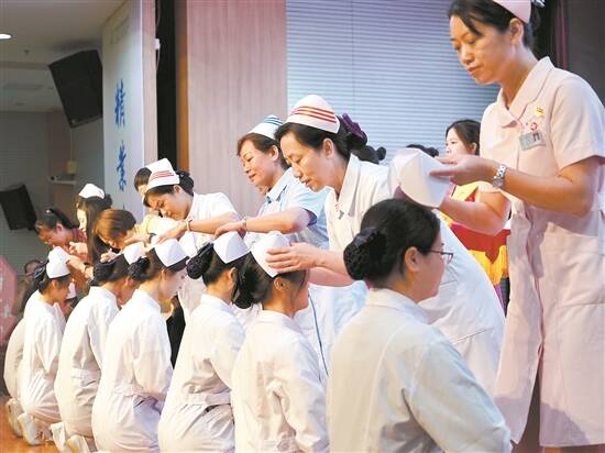 对护生们来说,这是转变成为护士的重要时刻——在学校活动中心,来自各大医院的护士长为护生戴上燕尾帽。在尔后的燃烛仪式上,护生接过前辈手中的蜡烛,站在南丁格尔像前宣读誓词,寓意薪火相传,传递人间大爱的初衷与誓言。
