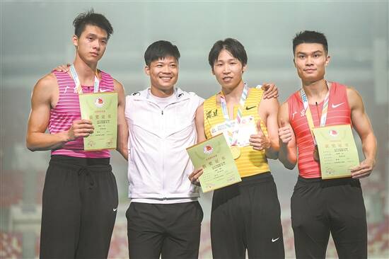 苏炳添(左二)为梁劲生(左一)挂上银牌 羊城晚报记者钟振彬 摄