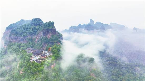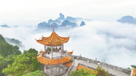 与平时丹霞地貌赤壁丹崖巍然耸立的“严肃”形象迥然不同的是,在云海中,绿树、丹崖、山亭以一种婉约、柔和的形态交融在一起,让人顿感空旷悠远、舒适恬然。云海如同丝带缭绕在僧帽峰、天柱石、姊妹峰、观音石周围,尽显万千气象,构成的美景变幻无穷,让人大饱眼福。