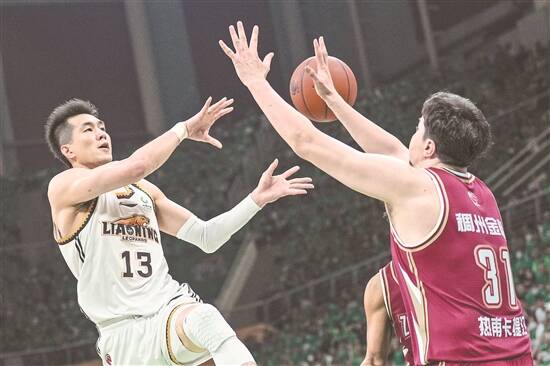 辽宁队球员郭艾伦(左)在比赛中传球 新华社发